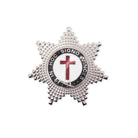 The Knights Templar Star. This striking pyramid star jewel with the red cross in the centre is complemented by silver coated metal with uncompromising quality.