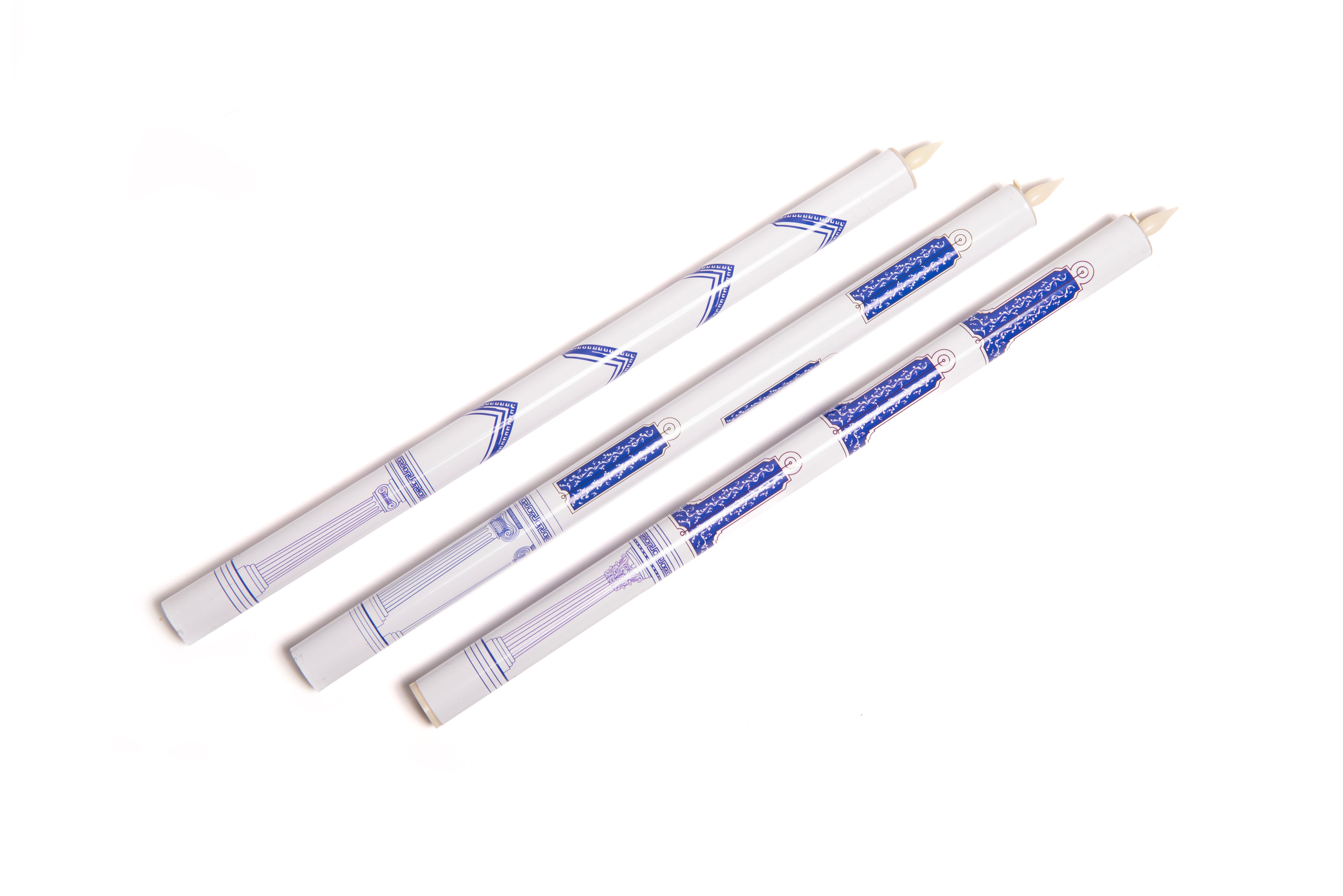 This complete set of three candles bears the emblems of the Worshipful Master, Senior Warden and Junior Warden for use at the pedestals of the East, South and West in Craft ceremonies.
