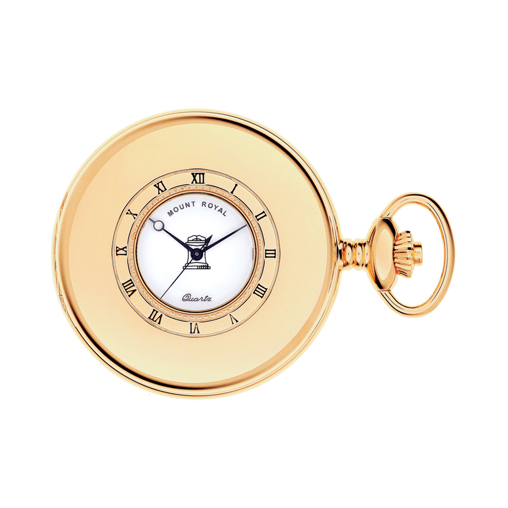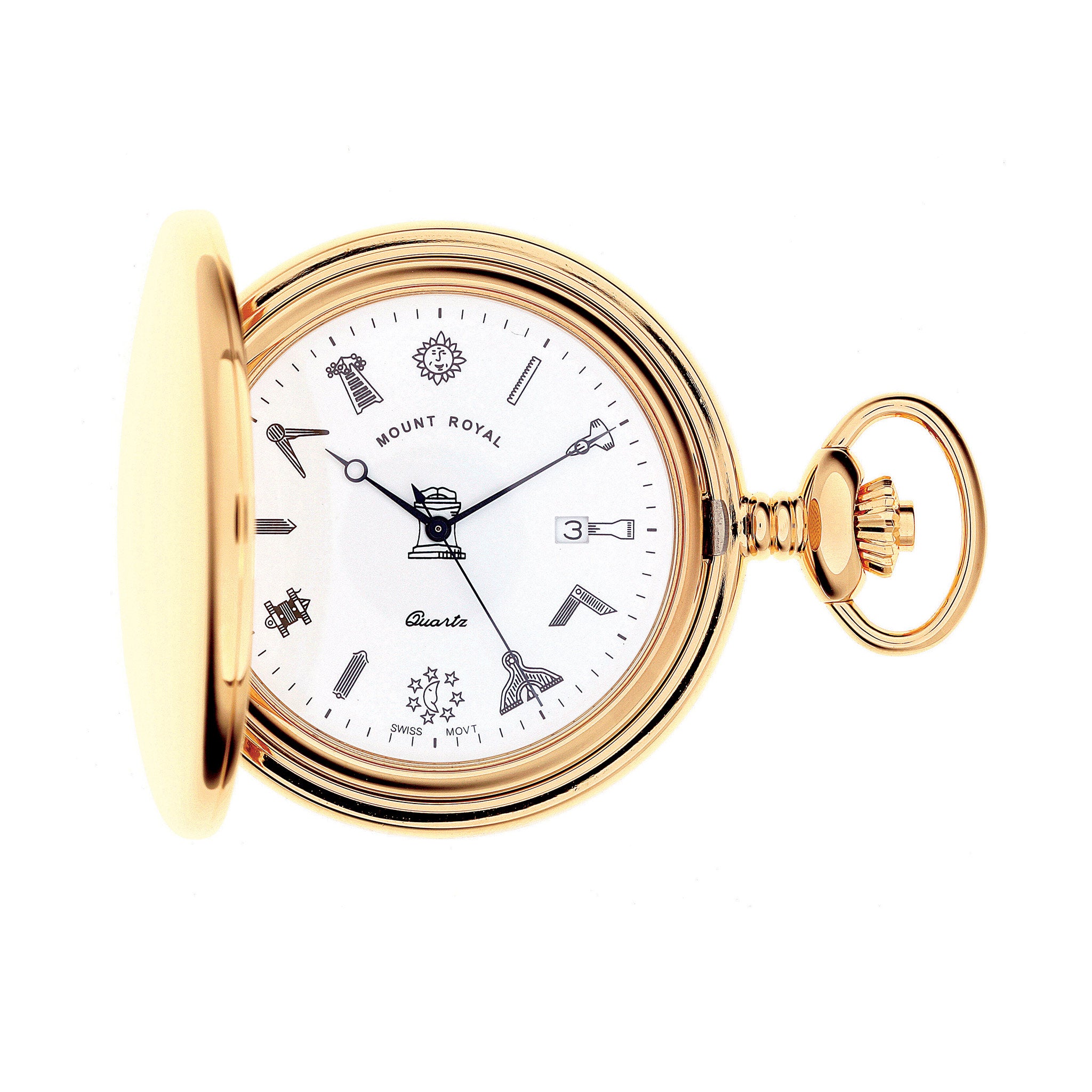 A Mount Royal Masonic pocket watch featuring a quartz calendar movement in a gold plated case with a polished back and completed by a white Masonic dial. This premium watch comes with a matching Albert chain, two year guarantee and presented in a luxurious box.