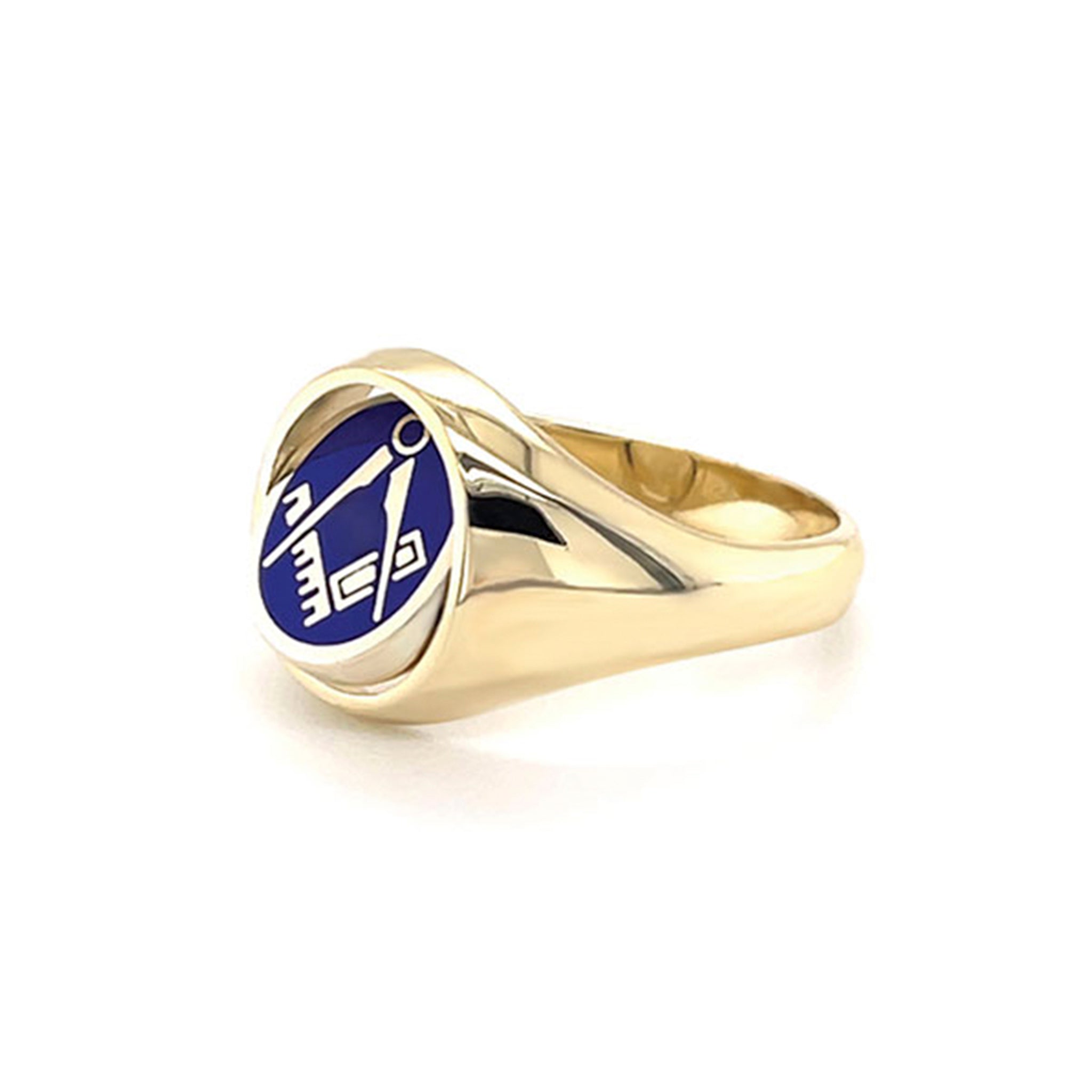 9 carat gold reversible Freemason's Masonic ring featuring the square & compasses symbol within a dark blue enamelled setting. Available in sizes N to Z, presented in a gift box.