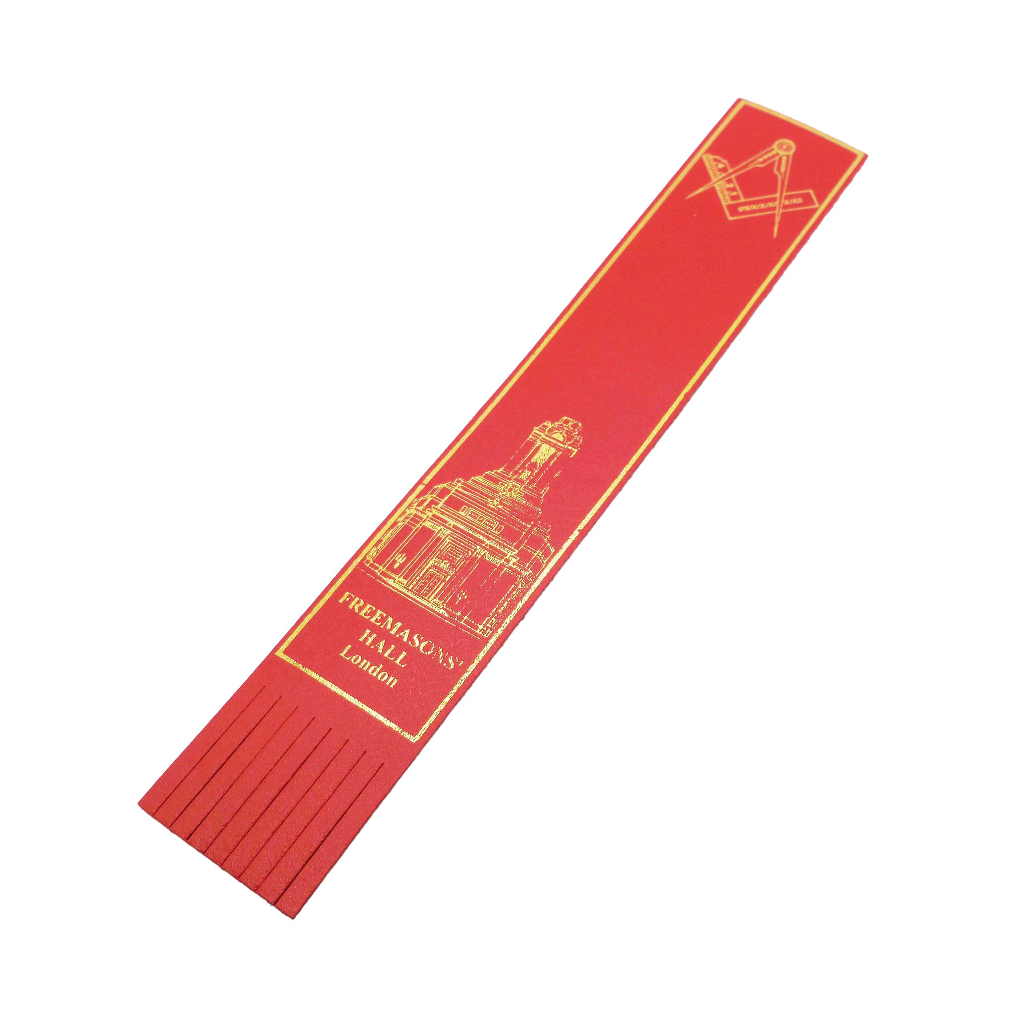 A red leather bookmark displaying the Freemasons' Hall Coat of Arms and the iconic square and compasses emblem.