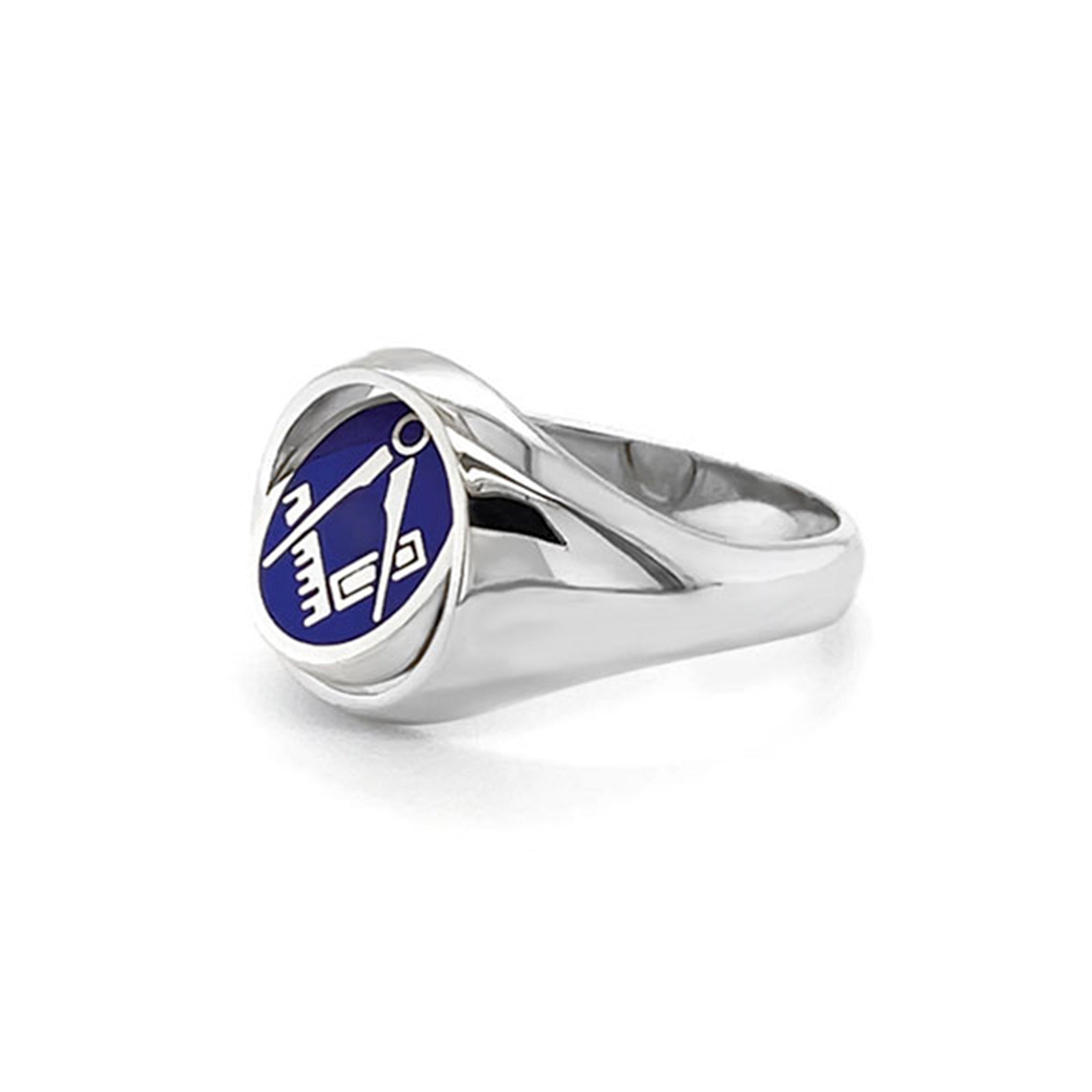 Sterling silver reversible Freemason's Masonic ring featuring the square & compasses symbol within a dark blue enameled setting. Available in sizes N to Z, presented in a gift box.
