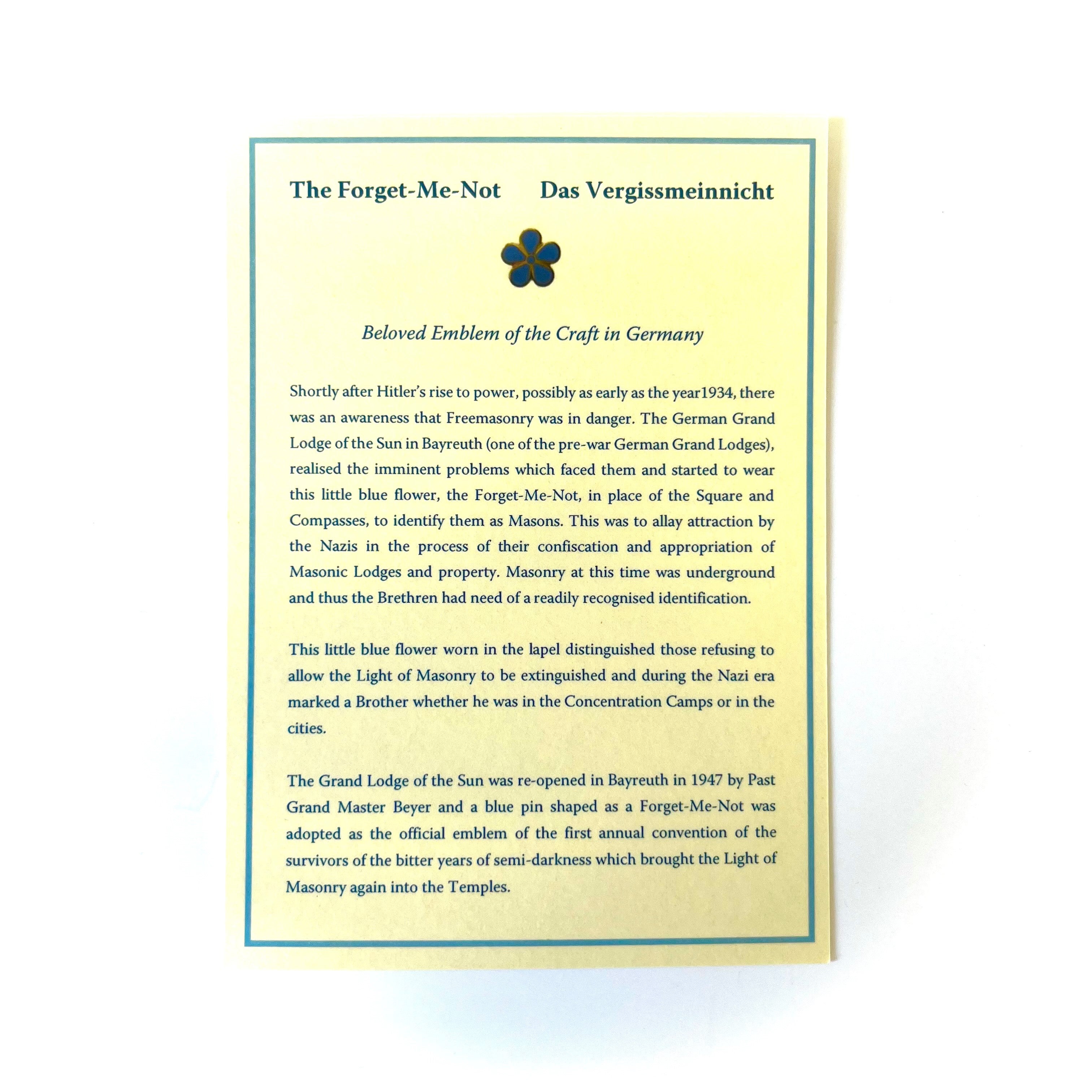 A unique set of the Masonic Forget-Me-Not lapel pin badge and the explanation card detailing the history and meaning of this most beautiful and iconic Masonic symbol. Perfect as a gift or memento for any and all Freemasons.