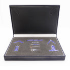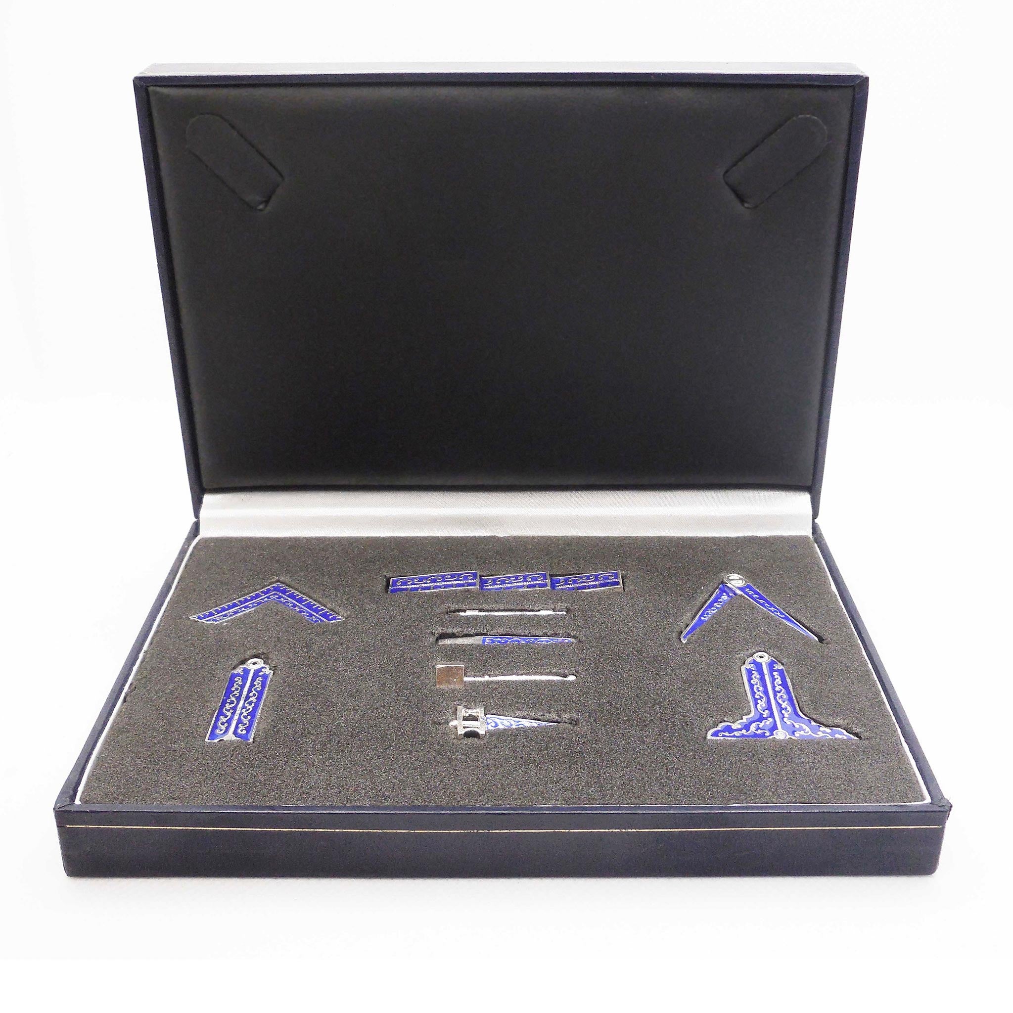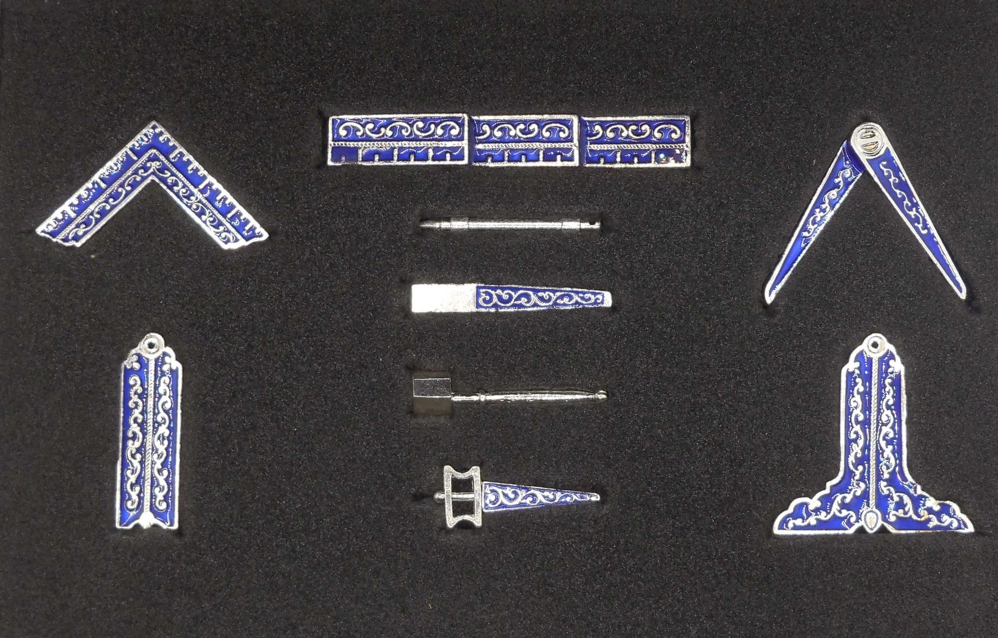 A Masonic 9 piece miniature tool set. These intricately crafted tools are silver plated and enhanced with a striking blue enamel filling and presented in a velvet box.