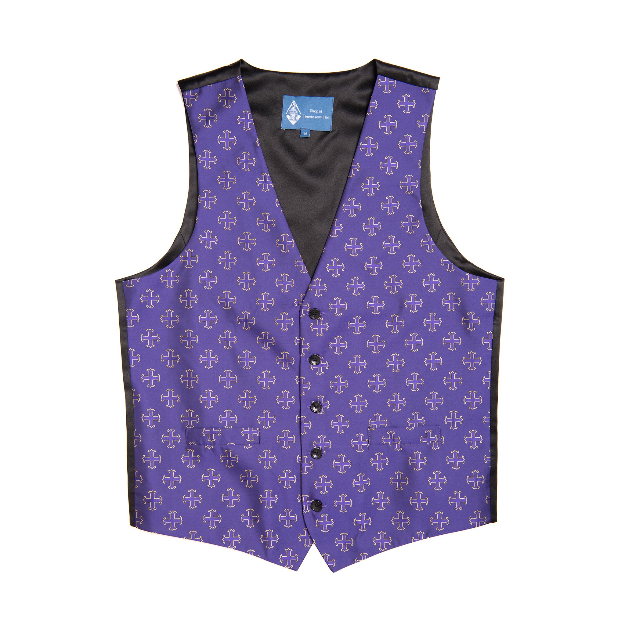 An eye catching waistcoat with the Red Cross of Constantine print. This purple and black, five-button, single-breasted design has timeless appeal.