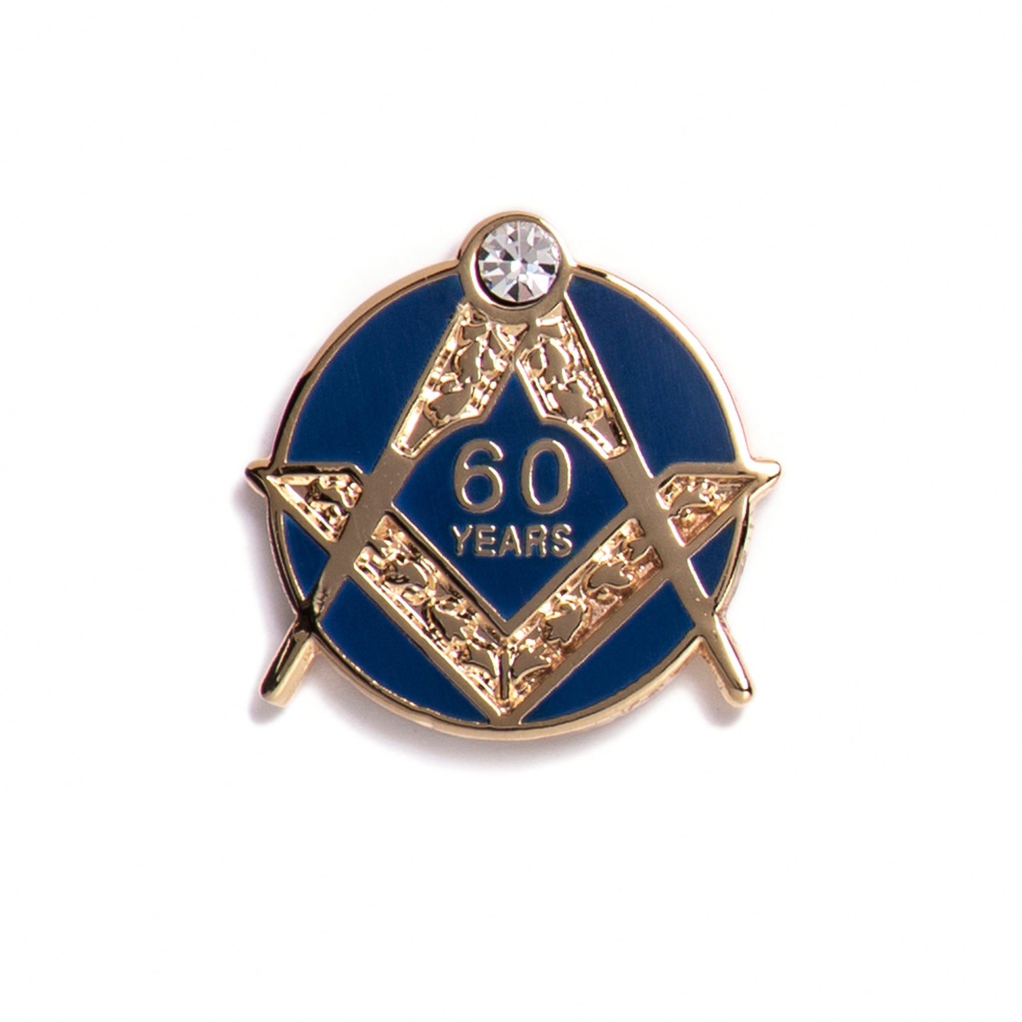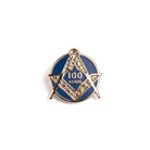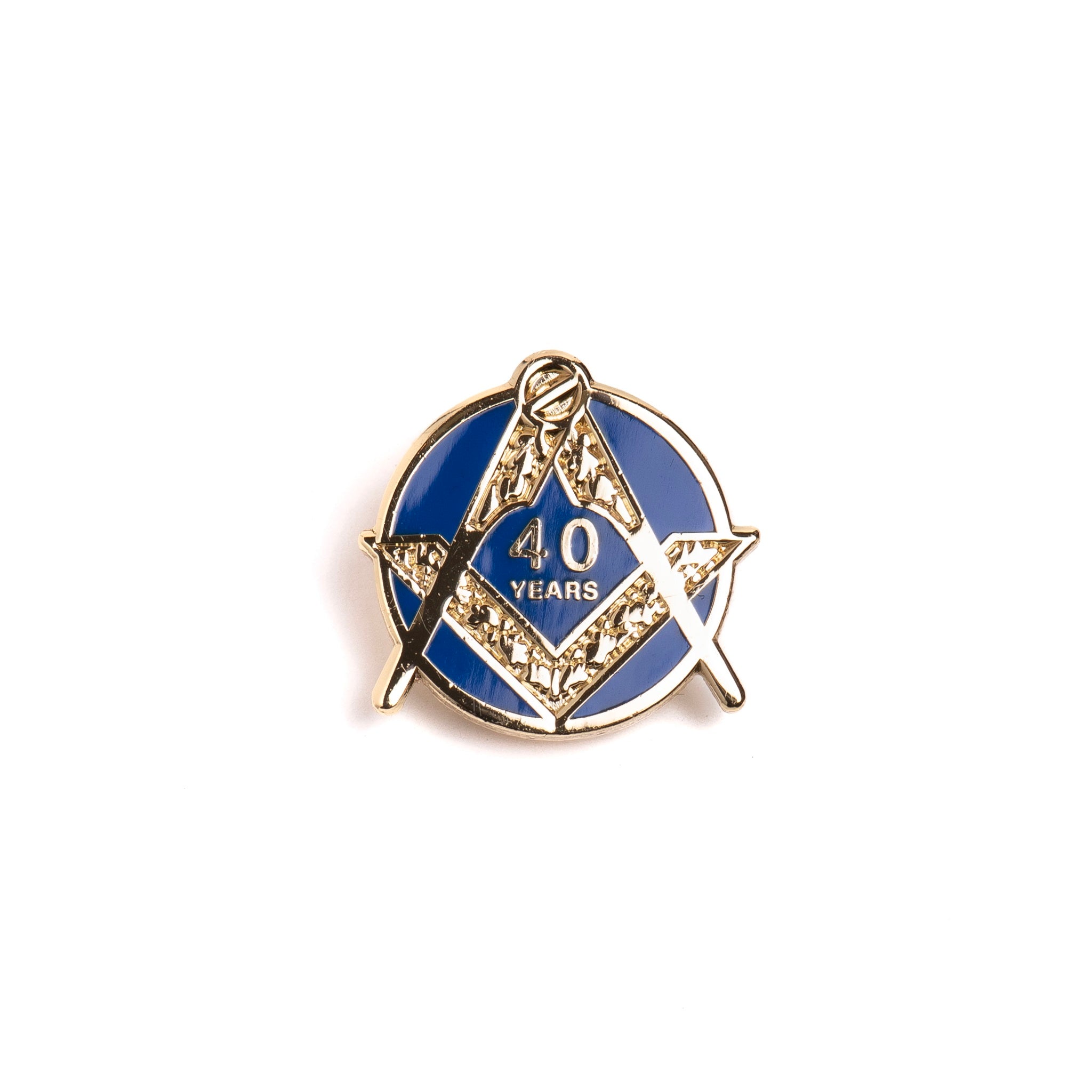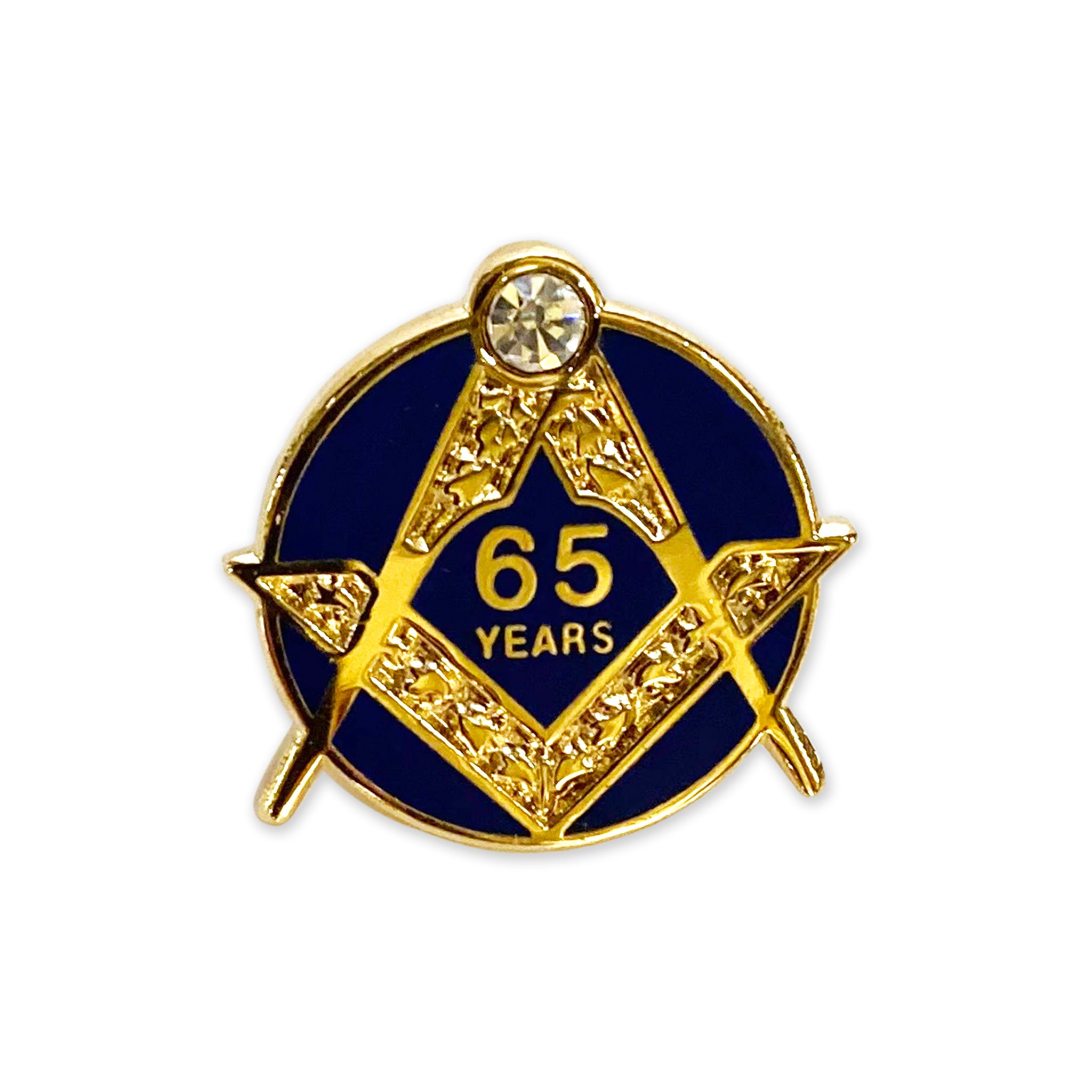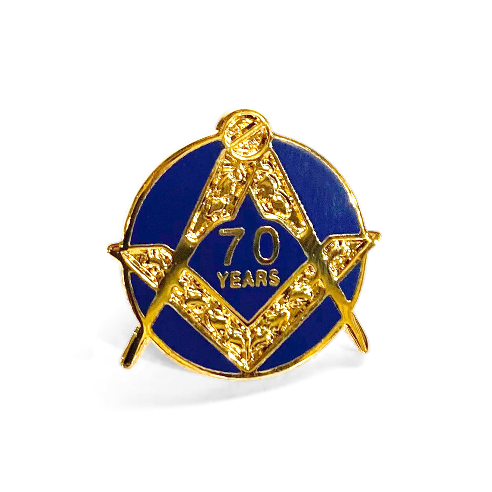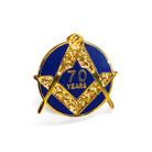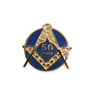 Blue and gold Square & Compasses Masonic Craft Anniversary lapel pin badges, available showing 10, 25, 40, 50, 60, 65, 70 and 100 years.