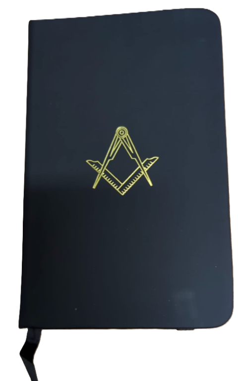 Black pocket size A6 black notebook embossed with Square & Compasses symbol and lined pages inside.